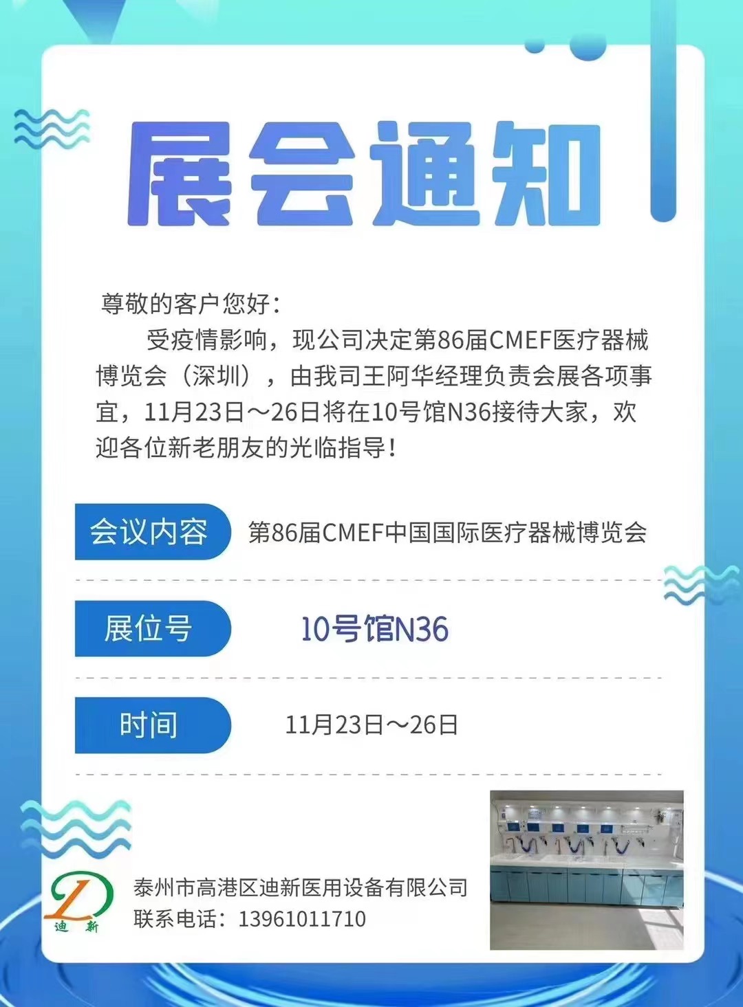 尊敬的客戶您好: 受疫情影響,現(xiàn)公司決定第86屆CMEF醫(yī)療器械博覽會(深圳),由我司王阿華經(jīng)理負責會展各項事宜,11月23日~26日將在10號館N36接待大家,歡迎各位新老朋友的光臨指導(dǎo)!......
